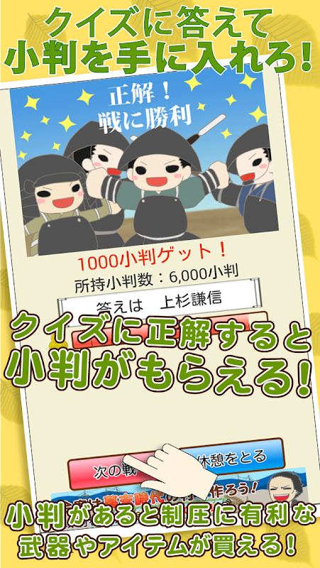 도중, 외부에서 공격해 오는 무장이나 적·침입자등이 퀴즈와 함께 다수 옵니다. 국가를 지키고 타국 제압하려면 상인으로부터 철포나 무기나 방어구를 효율적으로 손에 넣는 것도 중요하다. 나라가 커지면 조정, 중국 대륙에서 사자가 오는 경우도 있어 점차 관위도 오르고 나라가 발전해 나갈 것입니다. 반려와 자신의 두 사람으로부터 시작해, 가신을 늘리고, 강한 나라로 하기 위해서는, 당신의 역사 지식과 나라를 발전시키는 지혜가 필요합니다. 앞으로 당신은 퀴즈에 도전하면서 전국 시대를 살아내 천하 통일을 완수하는 것입니다.