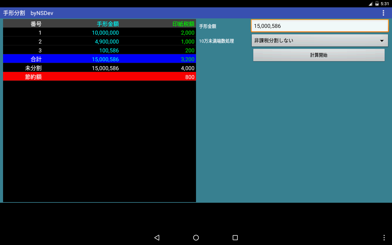 手形の印紙税を少しでも少なくするために手形をできる限り少ない枚数で効率よく分割するアプリです。