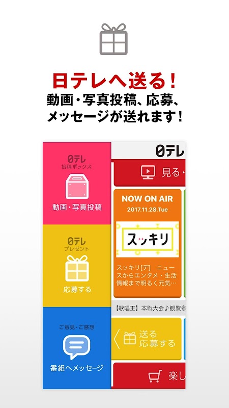 あなたが撮影した貴重な映像を送れる「日テレ投稿ボックス」、番組プレゼントや各種キャンペーンに応募できる「日テレプレゼント」、番組へのメッセージが送れる「ご意見・ご感想」の3つがあります。