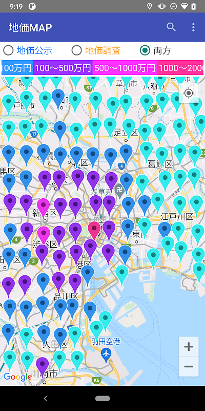 앱을 열면 주변 지가 정보가 자동으로 표시됩니다. 지가의 차이에 따라 지도 위에 표시되는 색상도 달라집니다.