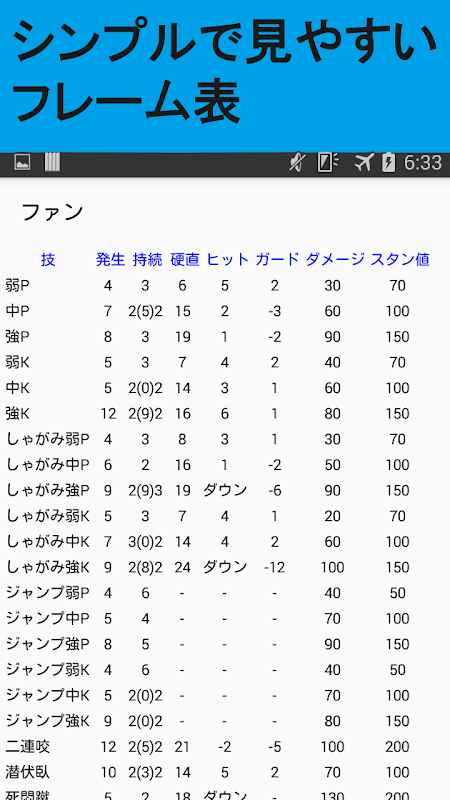 일본어 버전의 스트리트 파이터 5 (파업 5 파업 Ⅴ) 프레임 표 어플입니다.각 캐릭터의 프레임 시트와 히트 박스가 보입니다.캐릭터마다 메모장 기능도 있습니다.