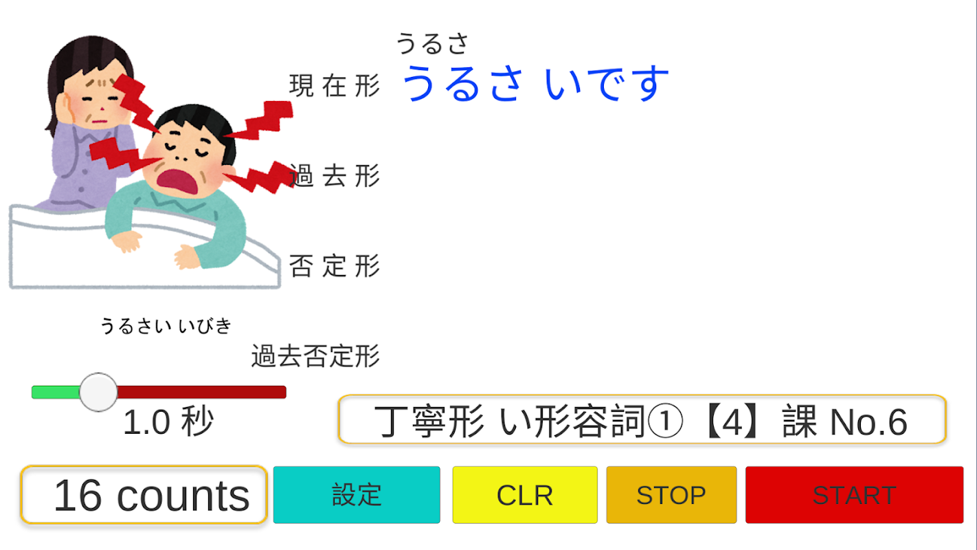 일본어 학습자의 일러스트레이션 '형용사 활용 "플래시 카드입니다. "현재형" "과거형" "부정형" "과거 부정형 '의 순으로 1 초마다 (0.5 ~ 2.5 초 가변)로 표시됩니다.