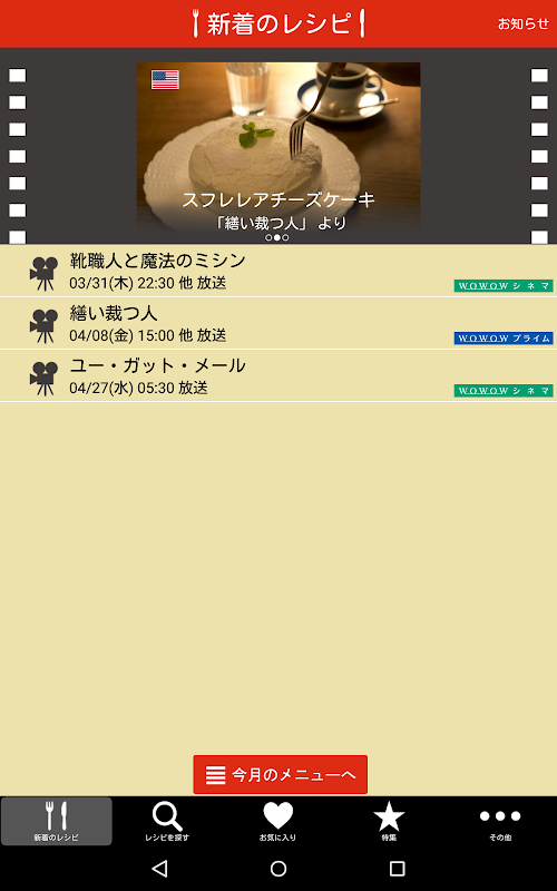 映画のタイトルや、たくさんの料理の種類の中から、180を超えるレシピを検索できます。