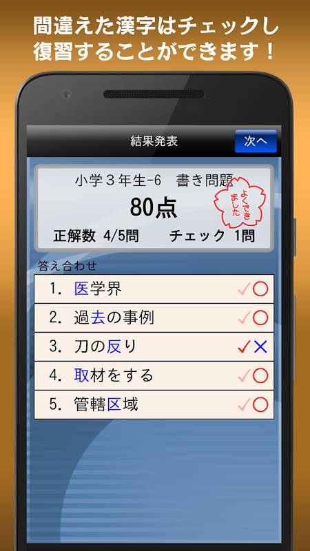 한자 연습이나 학년별 테스트 철저히에서 신경이 쓰인 한자를 선택하면이 모드에서 다시 연습 할 수 있습니다. 약한 한자를 집중적으로 연습 할 수 있습니다.