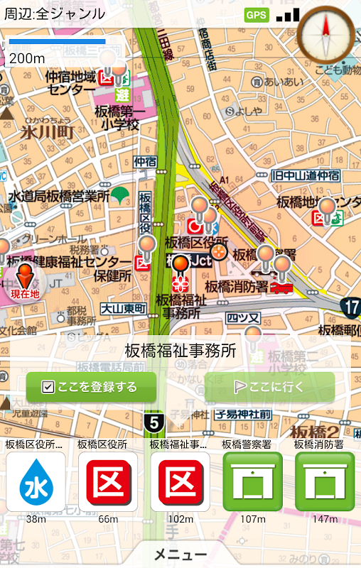 「板橋区防災マップ」は端末に保存されますので、インターネット通信環境のない状況でも地図を閲覧できるほか、端末のGPS機能を利用して現在地を地図上に表示させること(現在地表示)、現在地周辺の避難所や避難場所等の情報を検索すること(周辺検索機能)、あらかじめ目的地を登録しておくことで、現在地と目的地を結ぶ直線(ガイドライン)や目的地の方向を表示することが可能です。