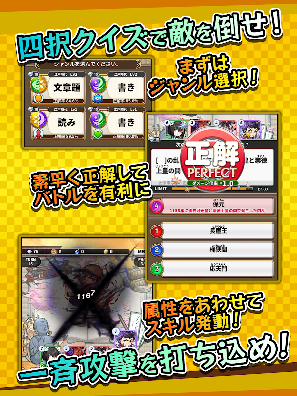 퀴즈는 중학・고등학교・대학 수험 레벨의 일본사에 대응하고 있어, 시험이나 수험 대책에도 최적입니다.