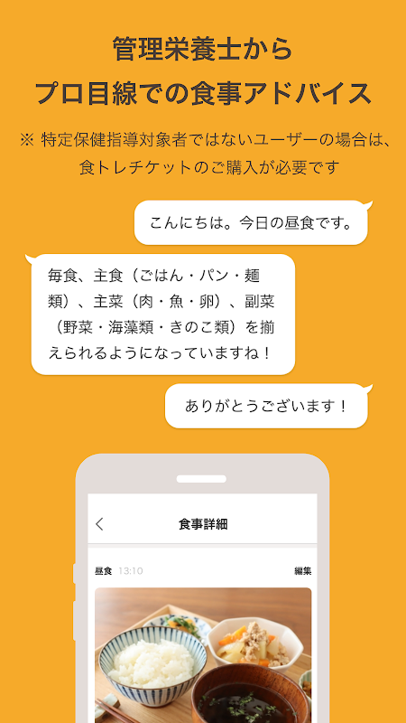 특정 보건지도 프로그램의 지원을 본 앱을 통해 받을 수 있습니다. 피츠플러스의 관리 영양사로부터의 어드바이스를 받거나, 정기 보고의 연락을 실시할 수 있으므로, 보다 부담없이 지원을 받을 수 있습니다.