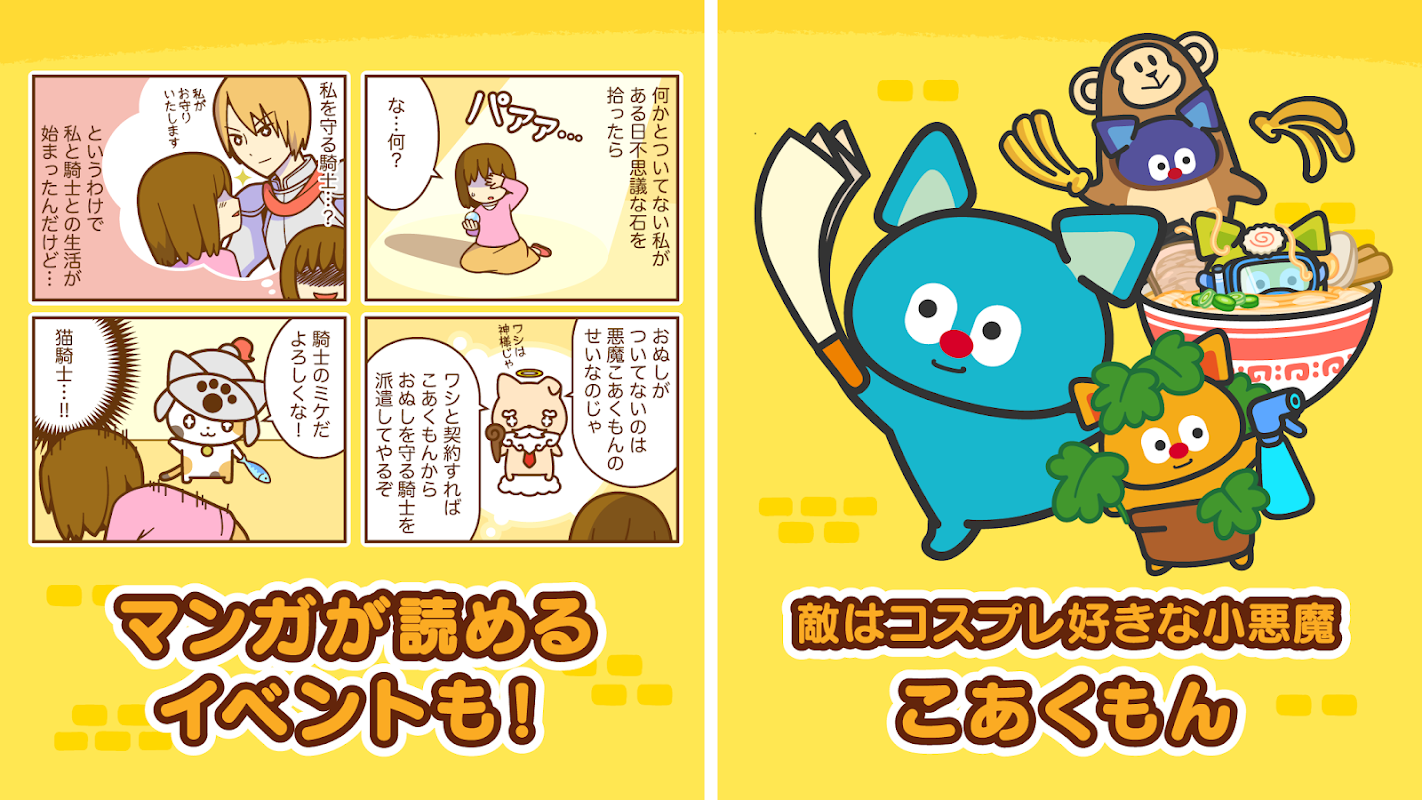 あなたを守ってくれるのはちょっとおバカで可愛い猫と犬の騎士!?いたずらしにくる変装コスプレ好きの小悪魔を退治しよう。