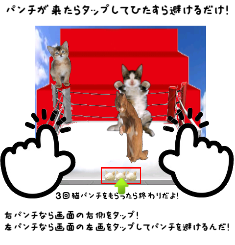 相手の猫が左右に猫パンチを放ってくるから画面をタップして華麗によけるんだ!