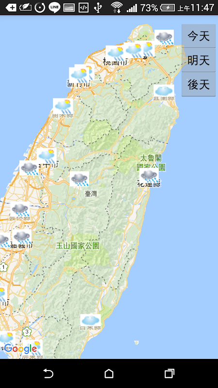 1. 即時取得氣象局資料,可選擇台灣各鄉鎮或北中南東部或全台灣於地圖上同時呈現氣象圖示,按觸則呈現當地氣象詳細資料