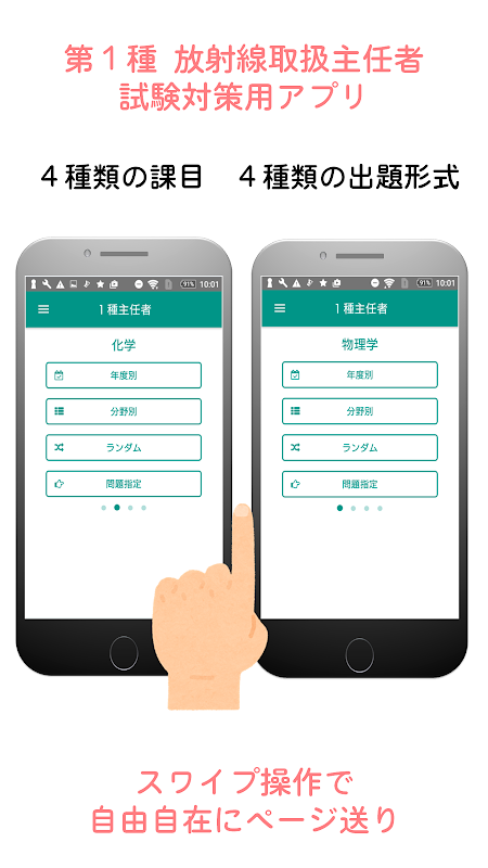 국가 자격 「제 1 종 방사선 취급 주임 자 '시험에 출제 된 문제를 푸는 어플입니다. 시험 합격을 향해 도전 해 보지 않겠습니까?