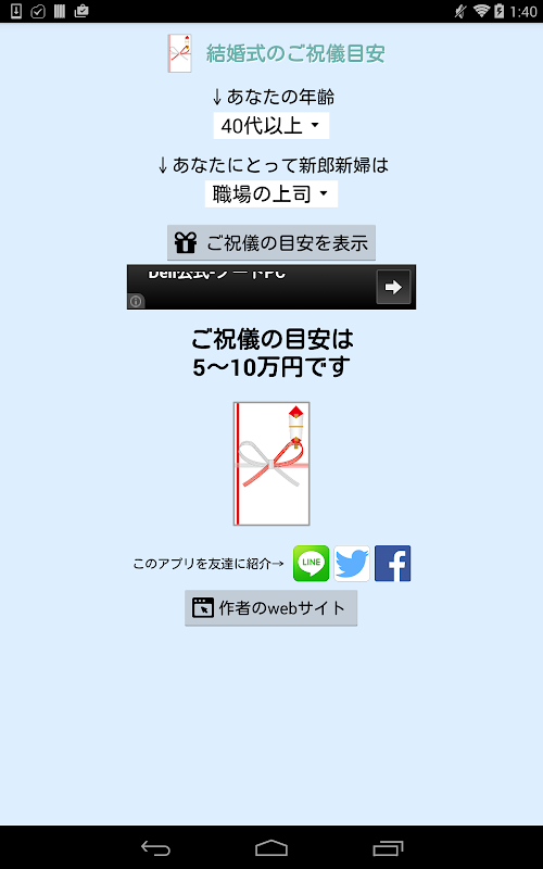 このアプリは自分の年齢と新郎新婦との関係を入力すると、ご祝儀の目安を表示してくれます!