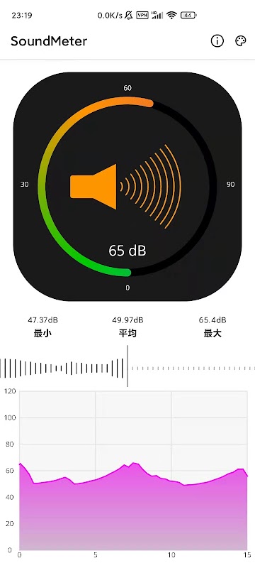 大多数安卓设备中的麦克风都与人声对齐。最大值受设备限制。大多数设备可能无法识别非常大的声音(超过90分贝)。所以请把它当作辅助工具。如果您需要更精确的分贝值,我们建议使用实际的声级计。