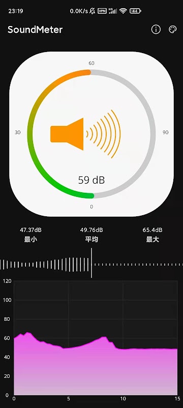 声级计应用程序通过测量环境噪声来显示分贝值,以各种形式显示测量的分贝值。通过这款智能音表应用,你可以体验整洁的高画幅平面设计。