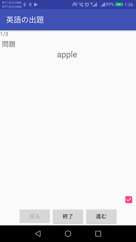 作成した単語を一覧する事もできクイズ形式で学習する事もできます。