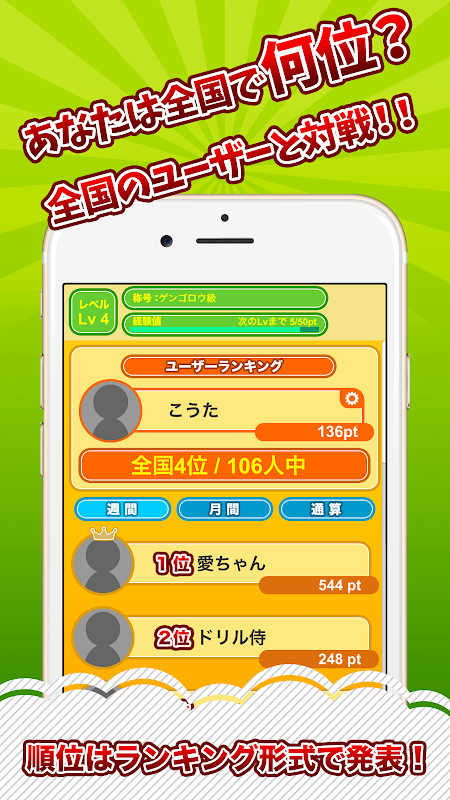 問題を解いてクリアすると経験値ごとにレベルアップ!