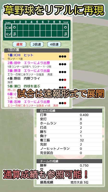 동네 야구 무대 방치 육성 시뮬레이션 게임. 선수를 육성하여 키운 팀에서 경기를 일본 제일을 목표로하자!