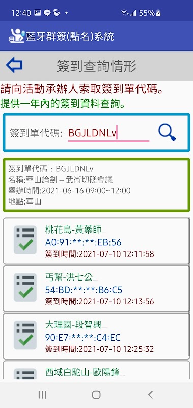 出席者可以透過「查詢簽到情況」的功能,輸入活動簽到單碼,系統便列出該活動所有已經被掃描而自動加入簽到單的資訊,出席者從而得知是否在簽到單內。活動簽到單查詢碼,可詢問承辦人或由承辦人公布,讓出席者得知,以便查詢出席簽到情況。