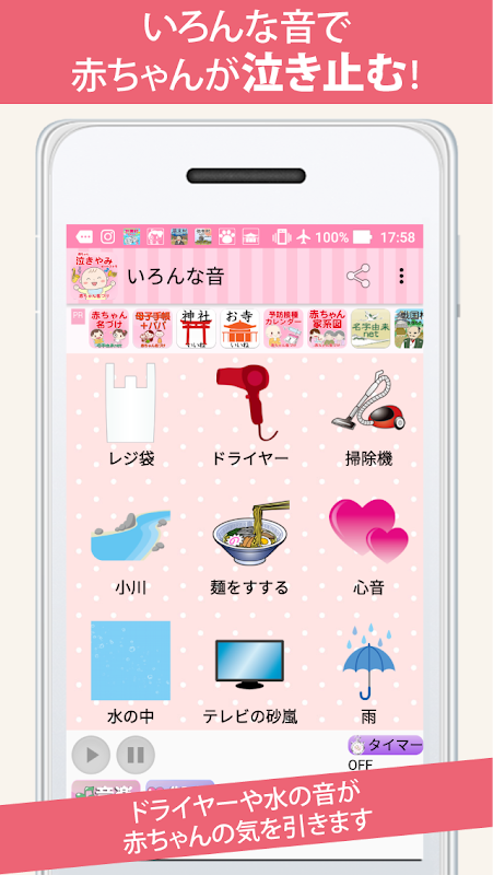 ・드라이어나 진공 청소기, 물의 소리, 텔레비전의 모래 폭풍 등, 아기가 울지 않는다고 하는 소리를 수록. (9종 모두 무료)