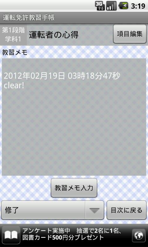 運転免許取得のため教習状態をメモできる手帳アプリです。修了状態の記録、注意されたところのメモ、仮免試験・本免試験の点数メモ等に使えます。