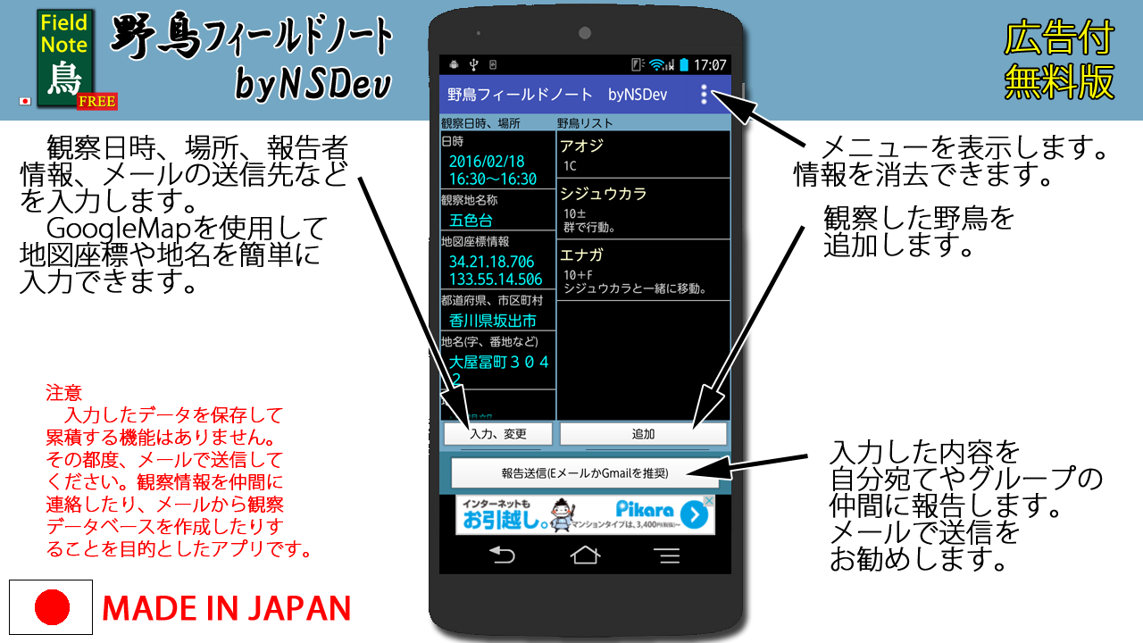 이 응용 프로그램은 카가와의 조류를 지키는 모임의 협력하에 만들었습니다.