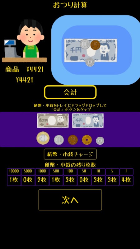 축제 계산은, 매장에서의 현금 결제를 시뮬레이트해, 스마트하게 낚시를 받는 달성감을 얻는 앱.