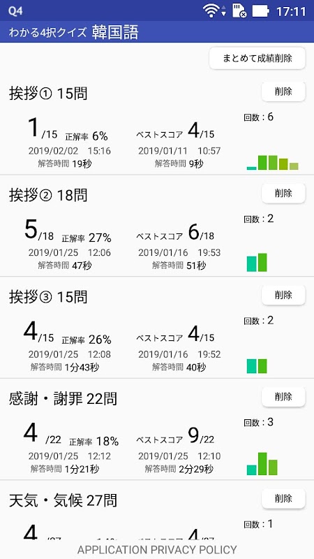 4 택 퀴즈의 결과는 기록됩니다. 기록 화면의 그래프는 왼쪽에서 오른쪽으로, 최근의 성적 하나 전에 두 이전 등 과거의 퀴즈 결과가 성적 화면의 퀴즈 제목을 눌러도 그 퀴즈가 시작됩니다.