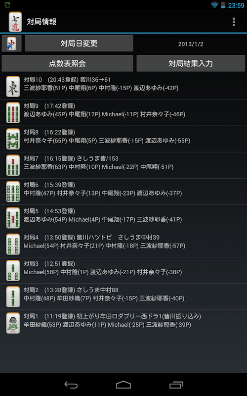 集計機能も強力!!ポイントや順位率はもちろん各順位の回数、トビ回数、平均点、連続トップ回数、相性などを瞬時に出力でき、メールで友達に配布することも可能です。