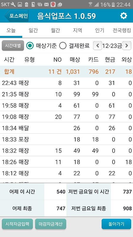 ■현재시간 누적매상액을 어제 동일한 시간과 지난주(같은 요일) 동일한 시간과 비교 ■신용카드 현금영수증 순수현금 전자화폐 등 결제수단별 집계 기능