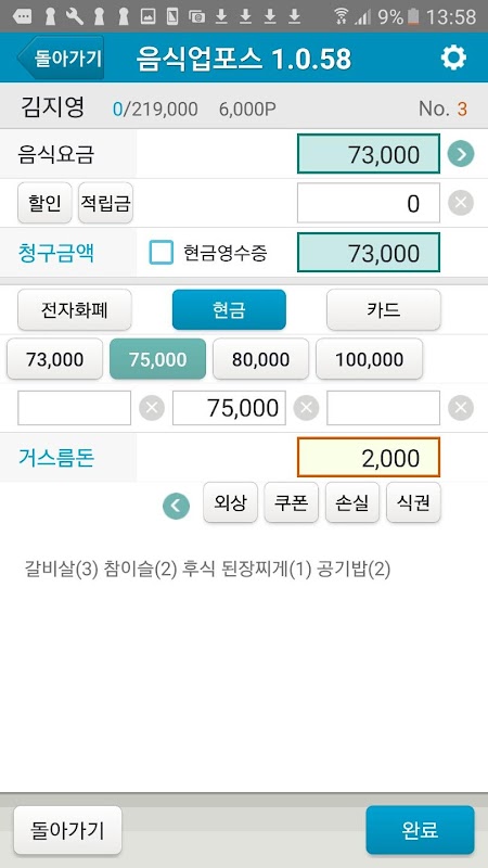 ■테이블 이동 합석 ■ 테이블 연결 기능 ■외상수금 및 예치금(선불금)입금 기능 ■포장판매 ■식권판매