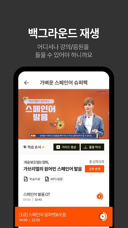 필요한 만큼 반복해서 들어요! 학습 단계별 강의와 MP3를 듣고, 학습자료도 이용해요. 전체 학습 진도와 강좌별 진행 정도를 알려드릴게요✨ 오늘도 한 강 들어볼까요?