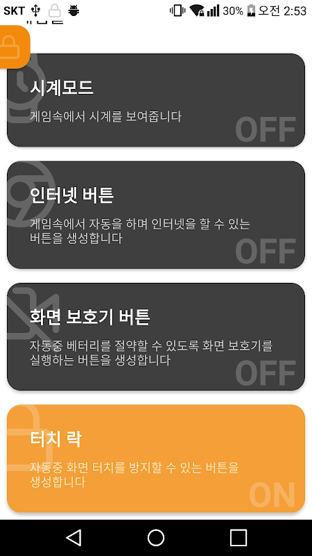 4. 터치 락 : 자동사냥을 하고있을 때, 화면을 실수로 터치하는것을 방지하기위해 터치를 막아놓습니다. (터치 락 은 특정 제스처를 취하면 풀리게됩니다)