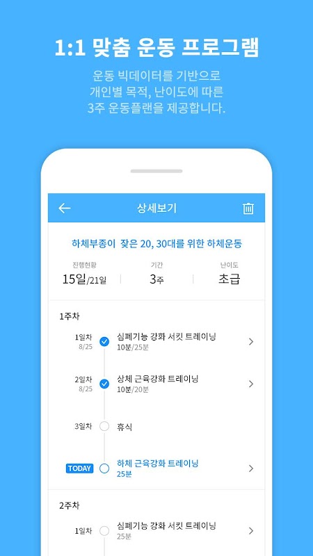 - 운동목적(스트레칭, 기초체력 향상, 근력 강화, 몸매관리)과 난이도(초, 중, 고급)에 따라 3주 운동 플랜을 제공 합니다.