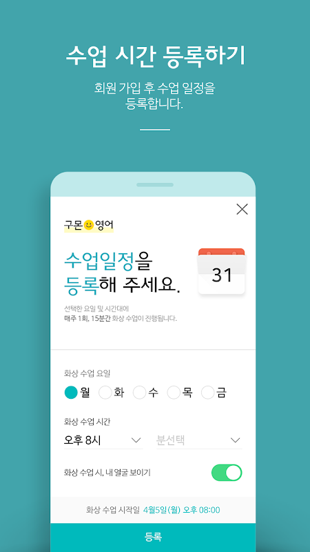 앱 실행 → 회원가입을 진행 후 로그인 → 일정 등록을 통해 학습 가능한 요일, 시간대 선택