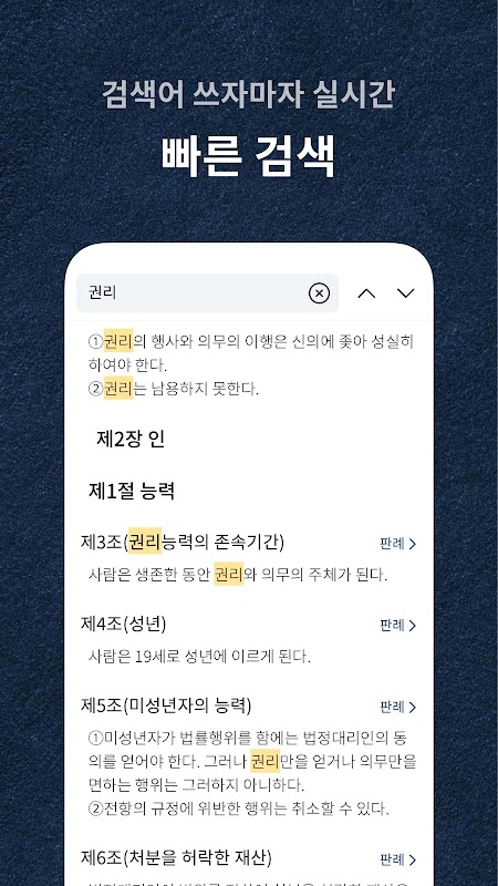 - 빠른 검색: 검색어를 쓰자마자 실시간으로 검색 결과를 제공합니다. 조문번호와 키워드를 한 곳에서 검색할 수 있어요.