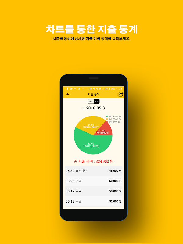 차트를 통하여 상세한 지출 이력 통계 파악