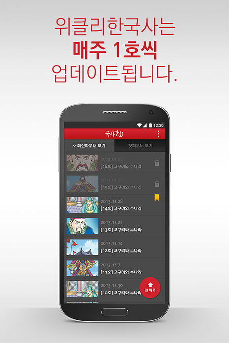 이미지, 리스트 로더 업그레이드! 이제 국사만화 리스트와 이미지뷰어에서 속도 업그레이드가 이루어지면서 엄청 빨라졌습니다. 보통 만화앱에서는 볼수없는 속도감을 체험하세요!