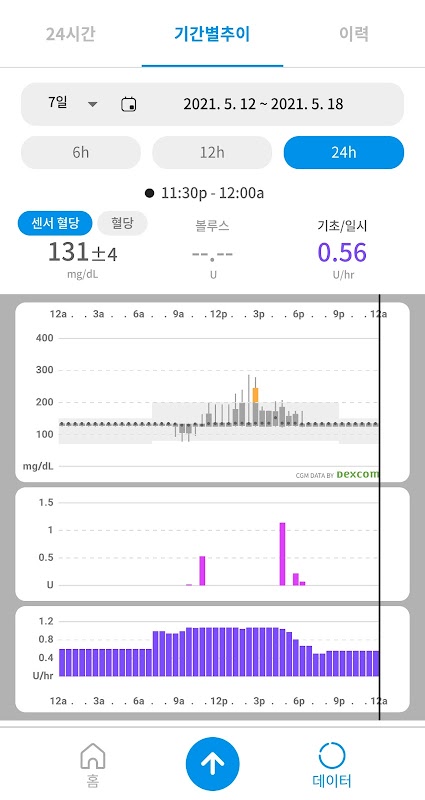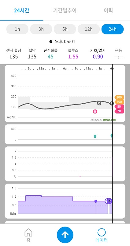 24시간, 기간별 추이 기능을 통해 최근 24시간 및 선택한 기간별 기초 및 볼루스 주입 이력, 혈당 추이, 탄수화물 섭취량, 운동시간 등을 한눈에 확인할 수 있습니다.