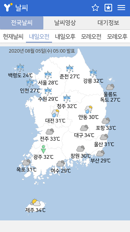 현재 날씨와 함께 내일과 모레까지의 예보를 확인할 수 있습니다.
