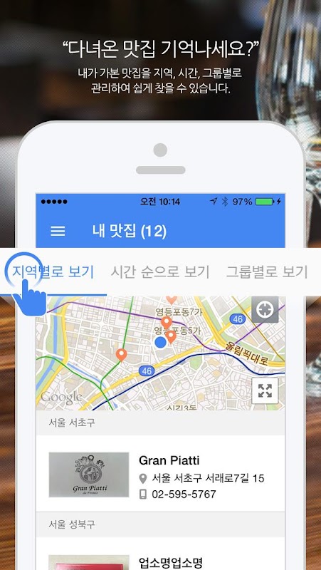 - 내가 가본 맛집을 지역, 시간, 그룹별로 관리하여 쉽게 찾을 수 있습니다.
