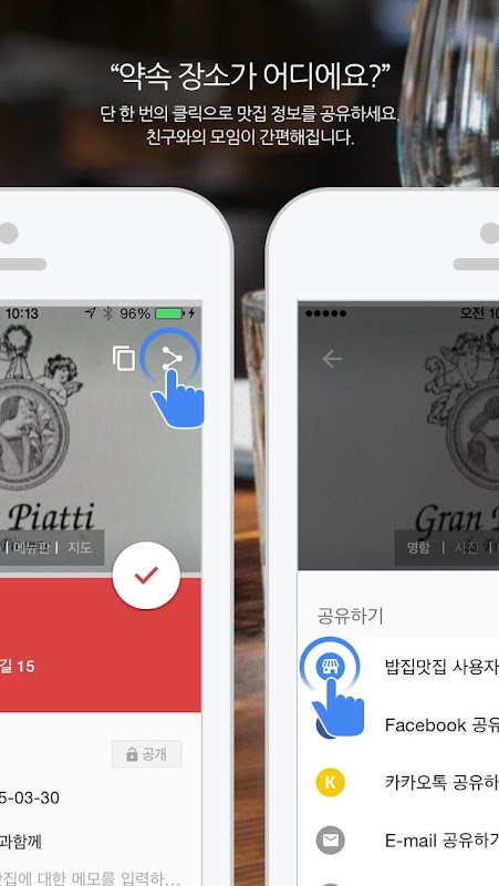 - 단 한 번의 클릭으로 맛집 정보를 공유하세요. 친구와의 모임이 간편해집니다.