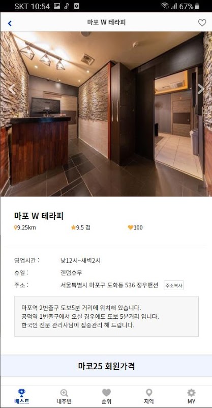 - 내주변 : 현 위치 주변 제휴 마사지 샵 위치 제공