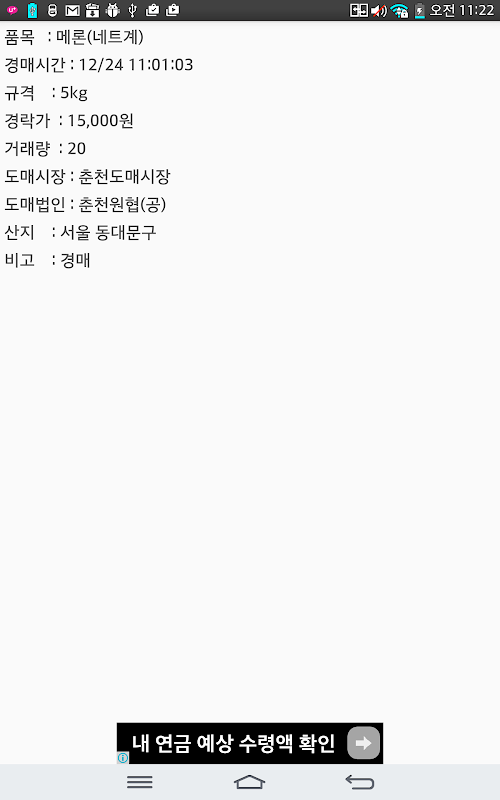 농수산물의 경매시간, 품목, 규격, 경락가, 거래량, 도매시장, 도매법인 산지등을 실시간으로 조회할 수 있습니다.