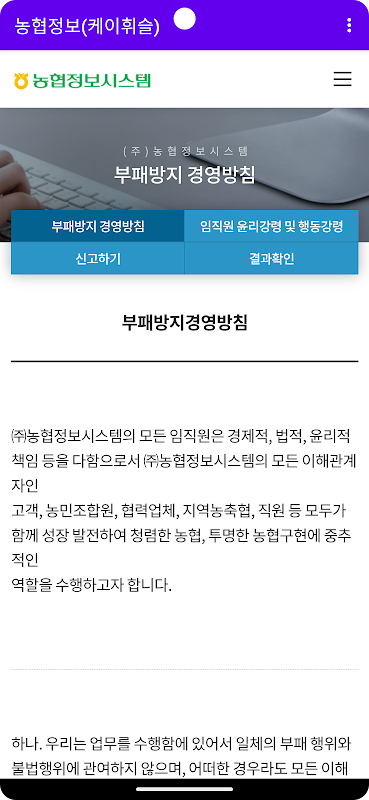 농협정보(케이휘슬)은 내부 임직원 혹은 외부 이해관계자가 안심하고 신고 할 수 있는 부정부패 신고 APP입니다.