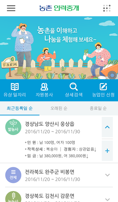 농촌인력중개 : 농촌 일자리 참여, 자원봉사, 농업인 일손신청, 인력중개센터 찾기 등