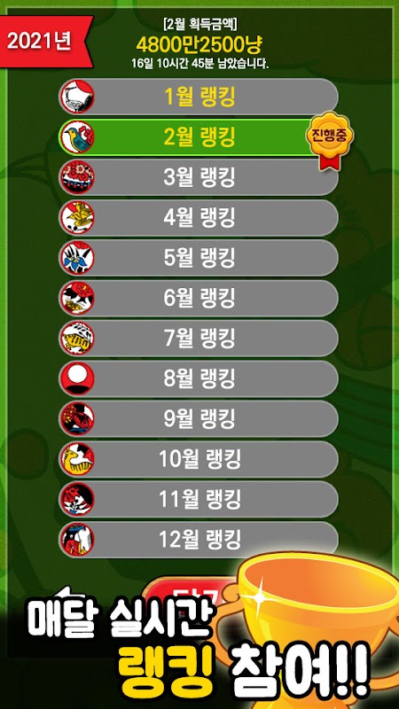 달달 맞고는 매달 게임내 분위기가 다채롭게 변하기 때문에 질리지 않고 즐길 수 있고 매달 갱신되는 실시간 랭킹에 참여해 다른 유저들과 실력을 겨룰 수도 있습니다.