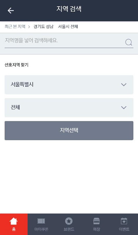 -매장찾기: 홈 화면 우측 상단의 매장 아이콘을 눌러 상세한 매장정보를 찾을 수 있습니다.