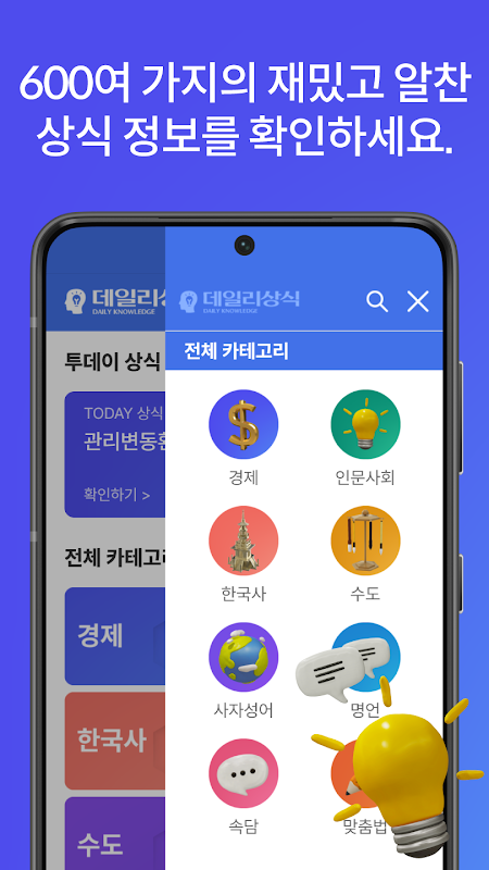 경제, 한국사, 속담, 사자성어, 수도, 맞춤법 등 여러 분야의 상식을 쌓아보세요! 투데이 상식을 통해 하루에 한 단계씩 더 똑똑해지세요~!