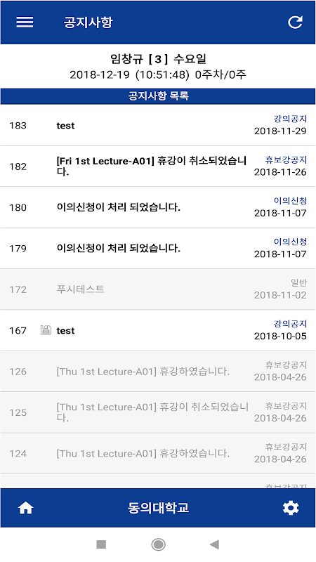 또한 출석체크에 수반되는 출결조회나 이의신청, 공지사항 확인은 물론 푸시 메세지도 제공하고 있습니다.