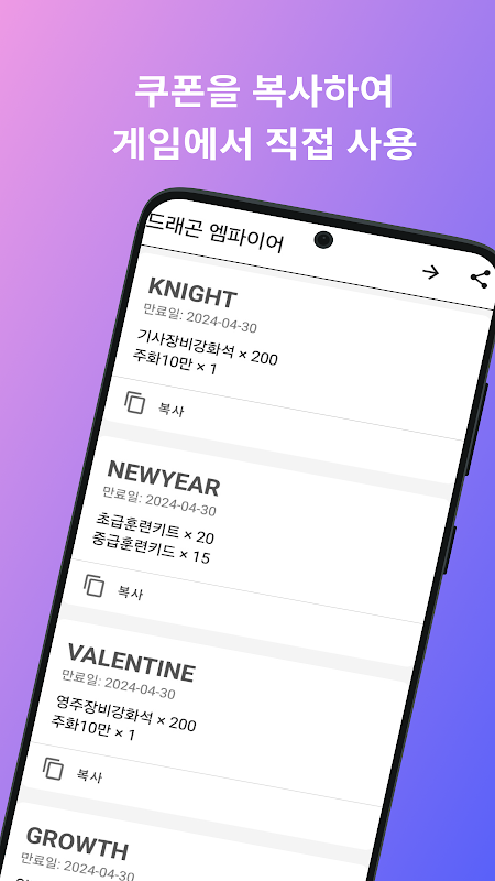 나만 못 쓴 쿠폰 만료되기 전에 사용하세요. "드래곤 엠파이어"의 쿠폰 정보를 보여주고 신규 쿠폰 발행되면 푸시 알림을 받을 수 있습니다.